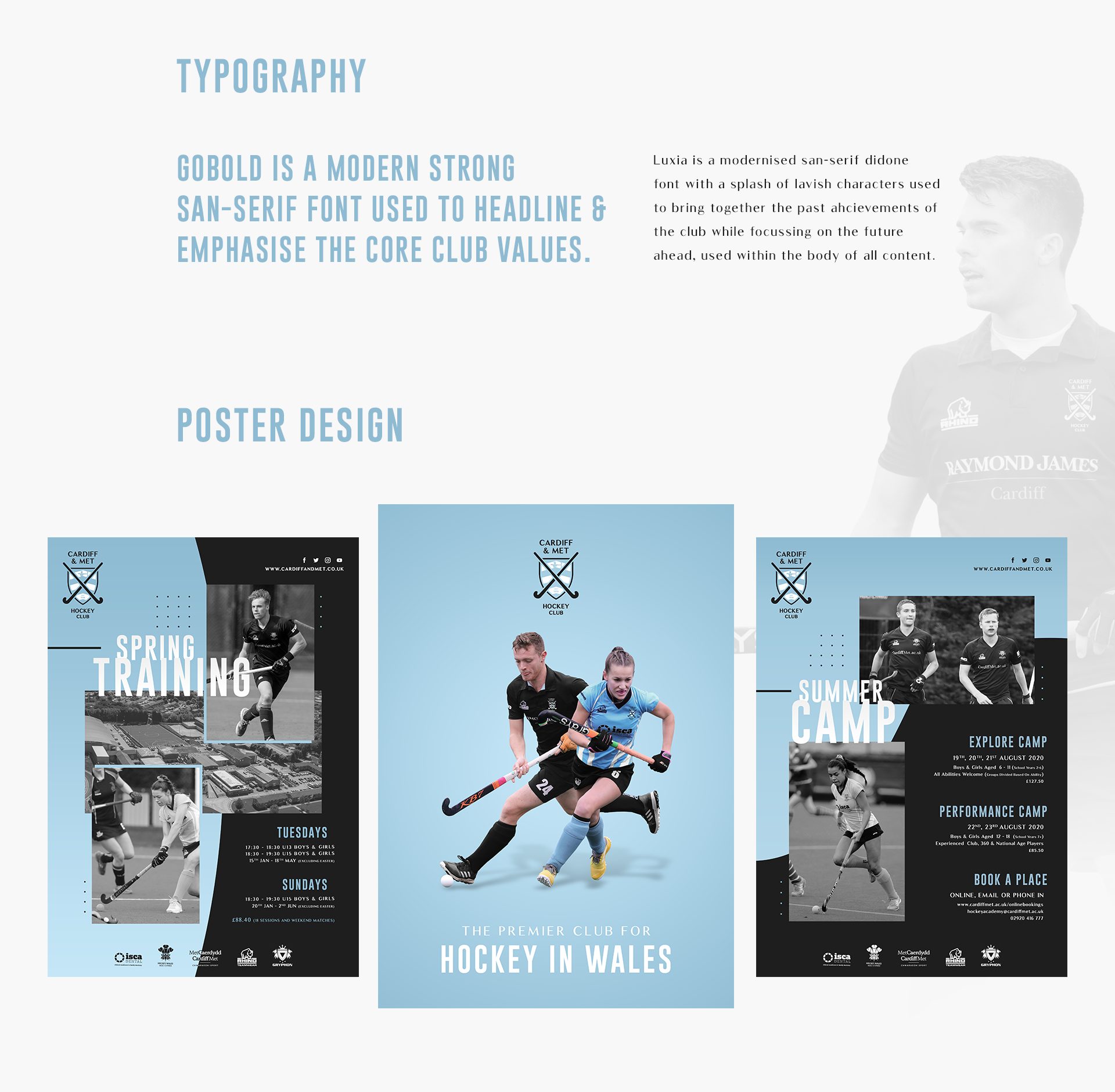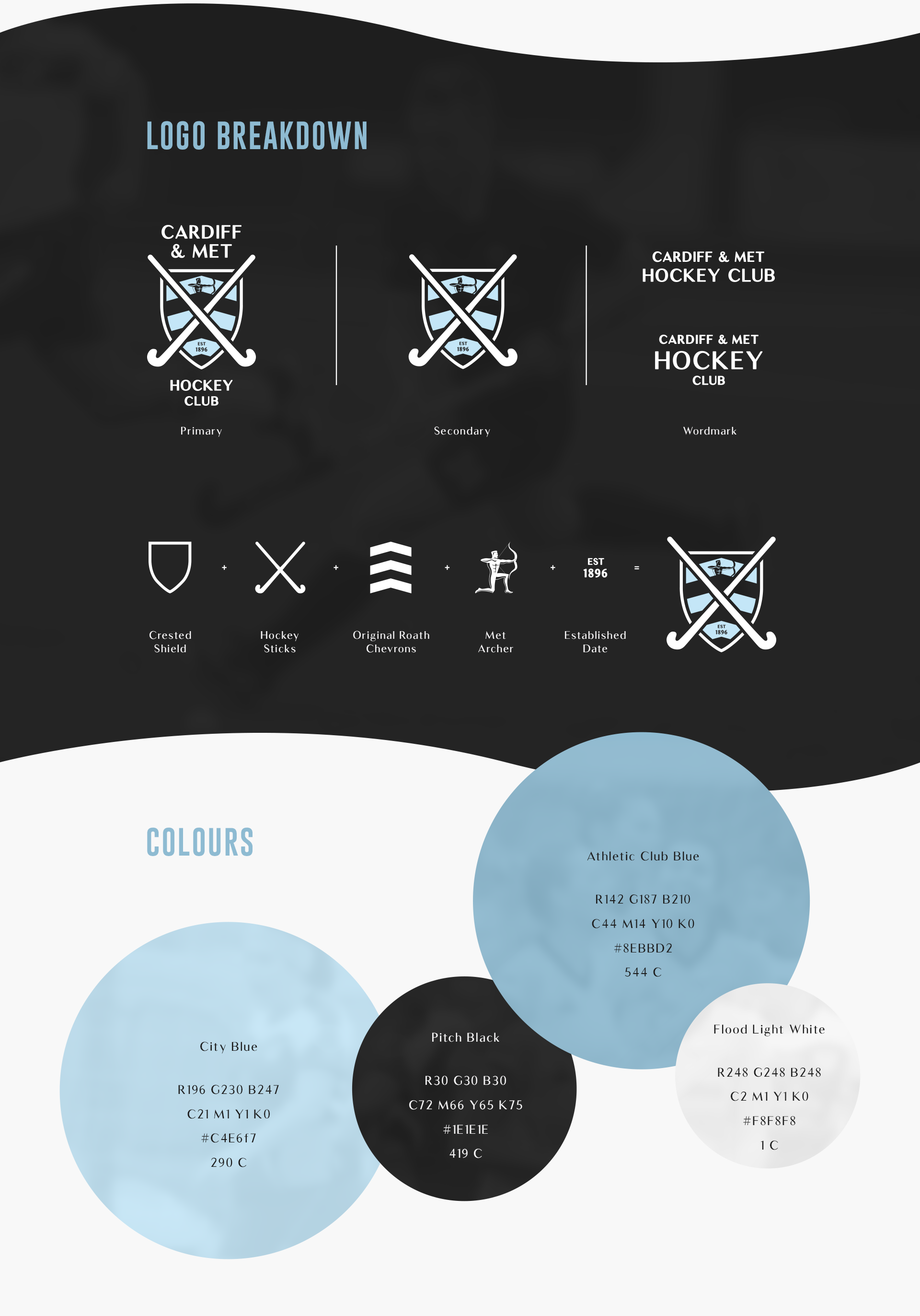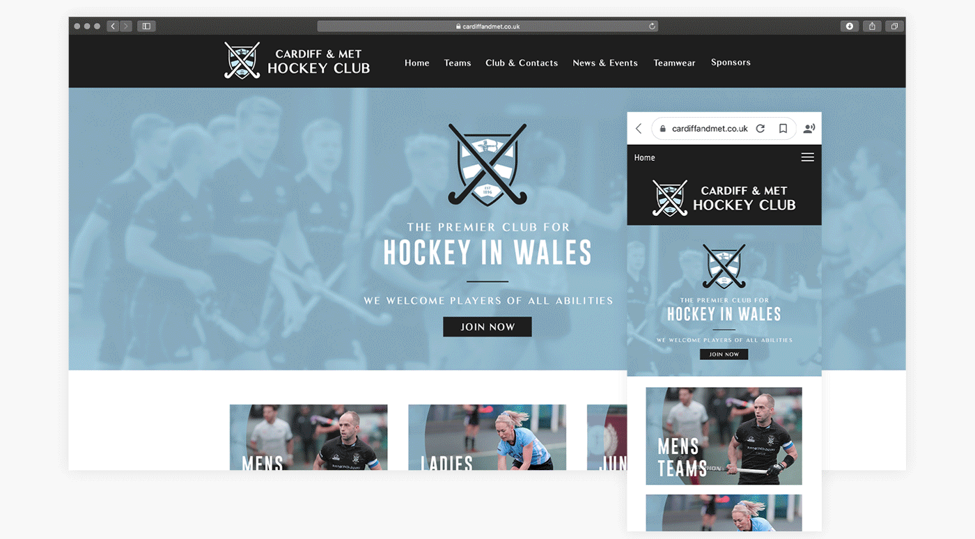 Rebrand for Cardiff & Met Hockey, including a new logo, colour palette, print materials, social media graphics, website mockup, and club handbook.